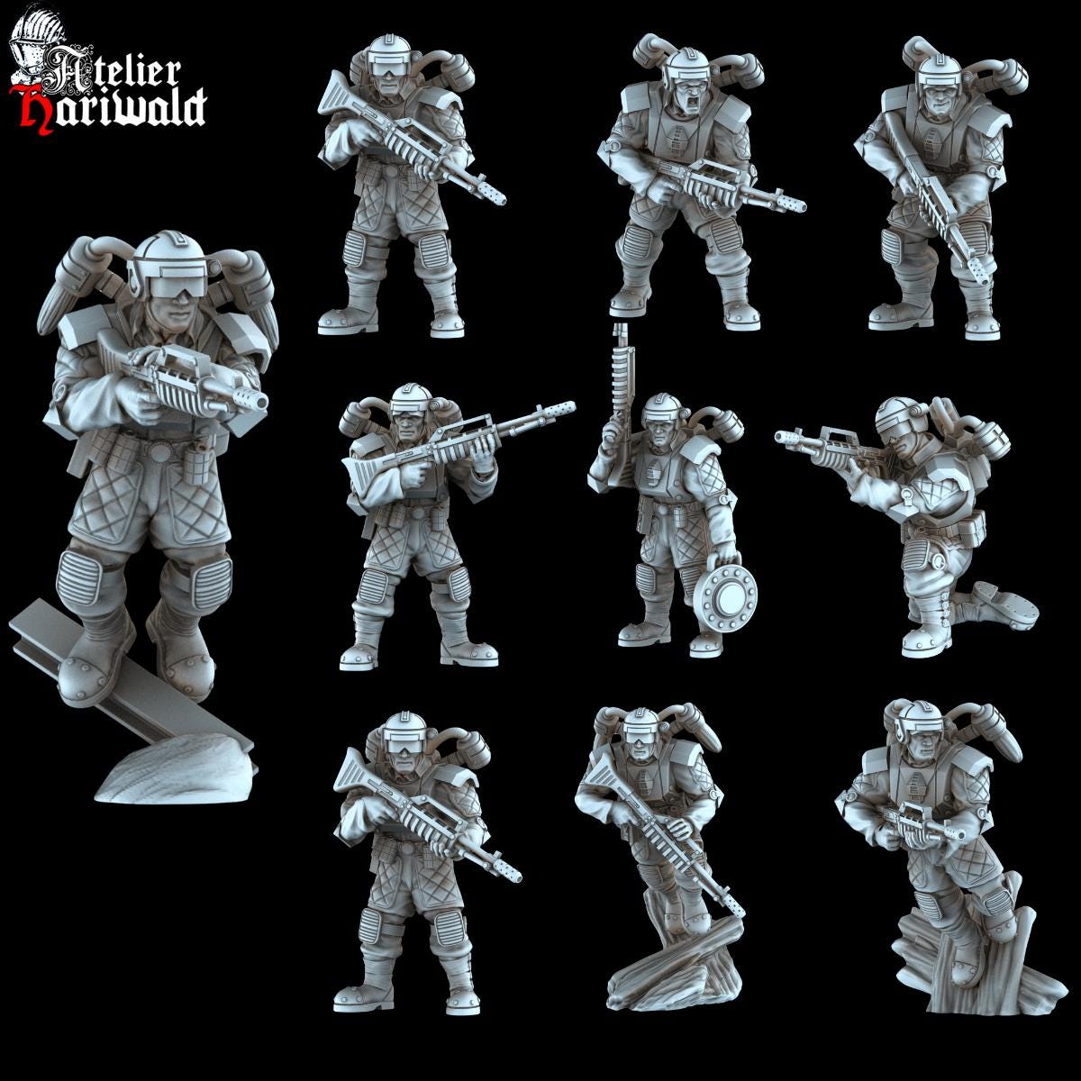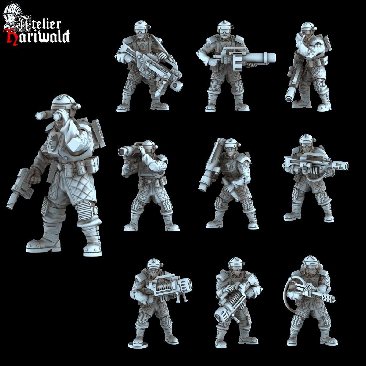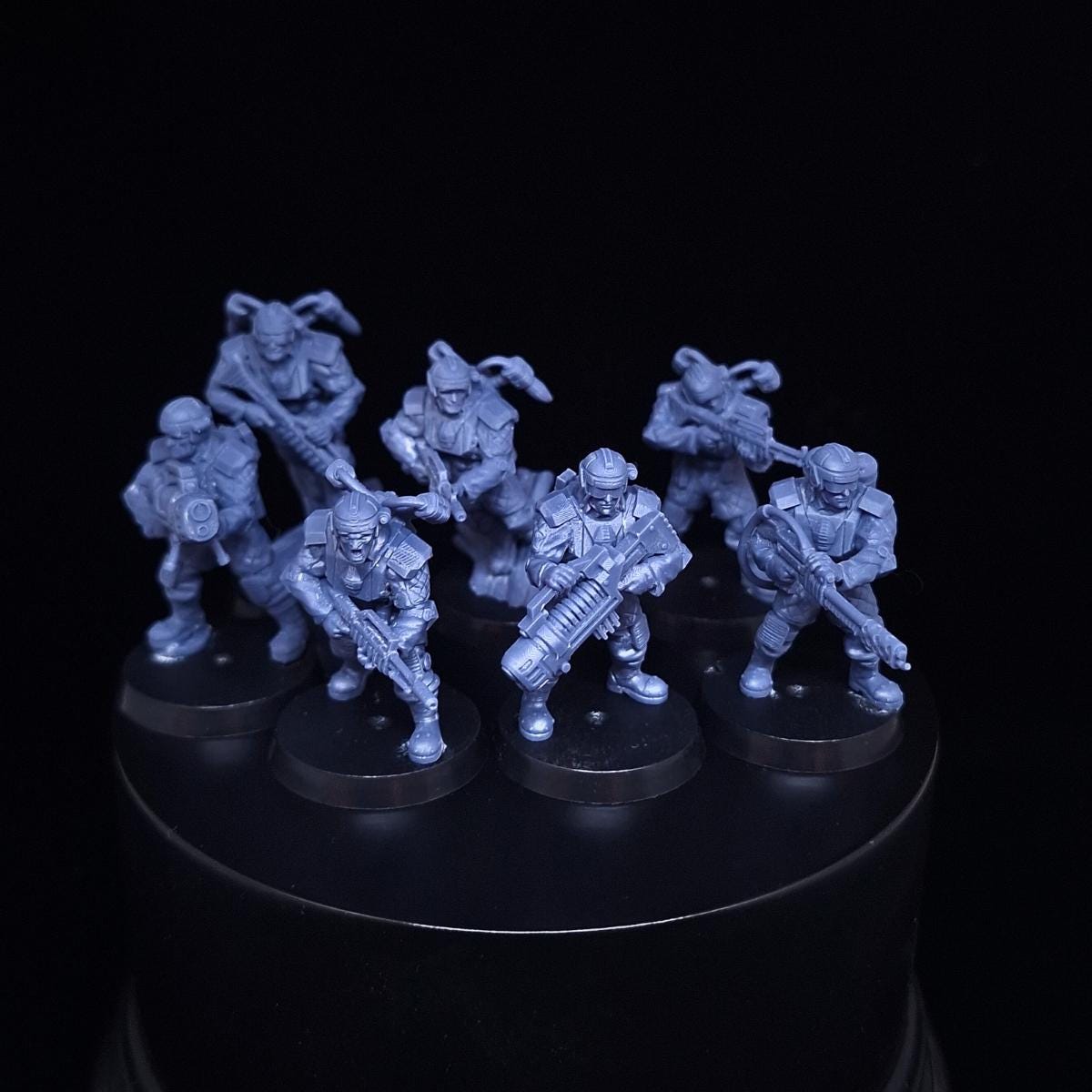 Ici, les figurines de la garde aéroportée. Idéales pour personnaliser vos armées de la Garde Impériale ou milices / forces de défenses planétaire. Disponibles en version classique à jump pack ou armes spéciales.